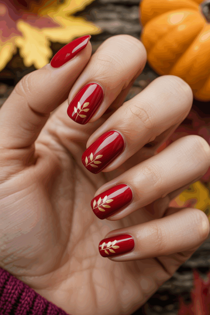 This style uses a rich red base color, perfect for fall. Tiny gold leaf accents are placed near the cuticle for a subtle sparkle.