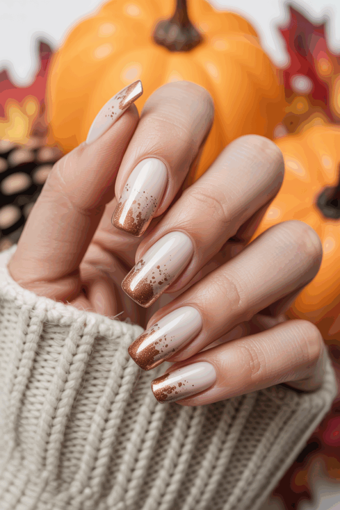 This design features a soft cream base that looks clean and simple. The bronze speckles on the tips add a subtle shine and texture. It works well on short nails and matches well with fall colors.