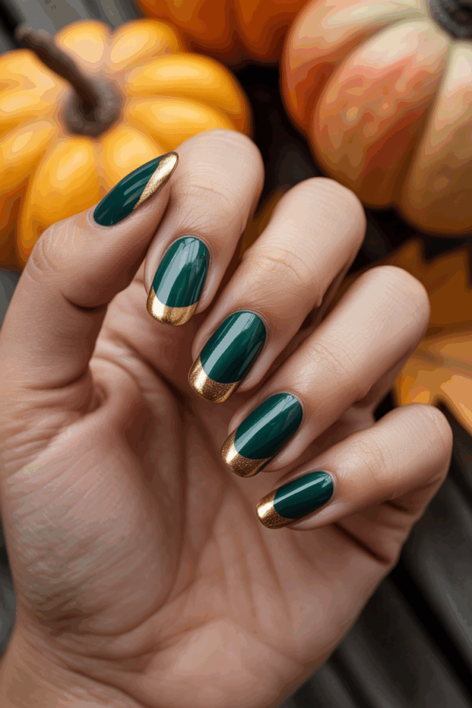 This look uses a dark forest green base that fits well with fall colors. The gold foil on the tips adds a simple, elegant touch. It works nicely on short nails, giving a festive but low-key vibe for Thanksgiving.