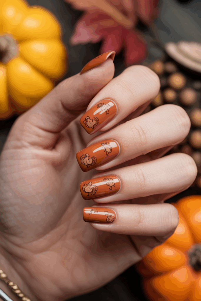This nail look uses a shiny rust orange base. The small turkey designs add a fun, seasonal detail without being too bold.