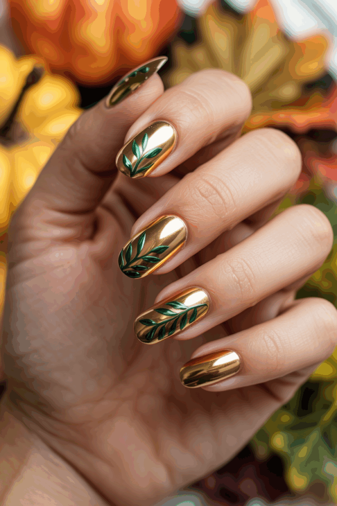 This design uses gold chrome polish combined with green leaf accents. It creates a fresh, natural look while staying elegant.