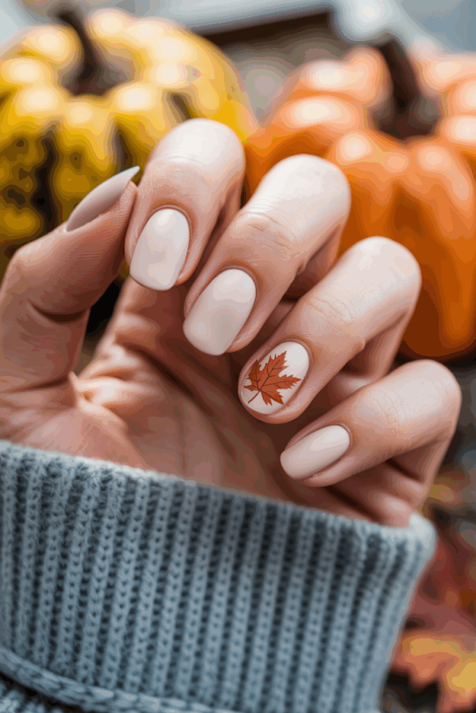 This design features a soft matte nude color as the base. A single maple leaf accent adds a simple, elegant fall touch. It works well for short nails and offers a clean, stylish look for Thanksgiving.