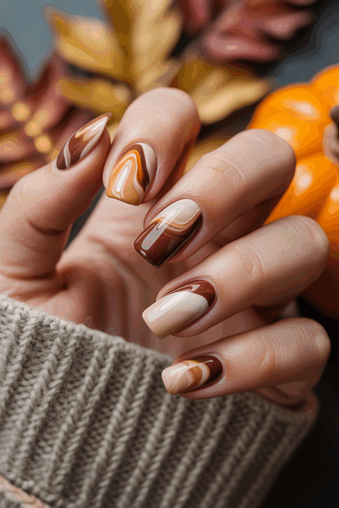 This style features short almond-shaped nails painted with abstract designs. The colors often include muted oranges, creams, and browns. These shades reflect the fall season without being too bold. The abstract patterns add a modern twist to classic autumn tones.