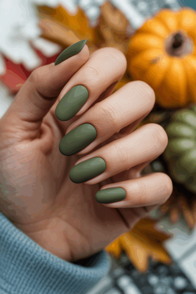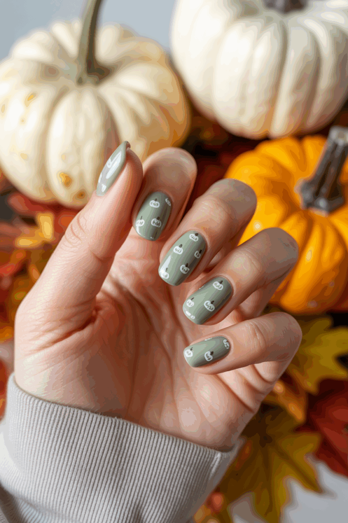This design pairs soft pale sage nails with small white pumpkin dots. The muted green shade creates a calm, natural look.