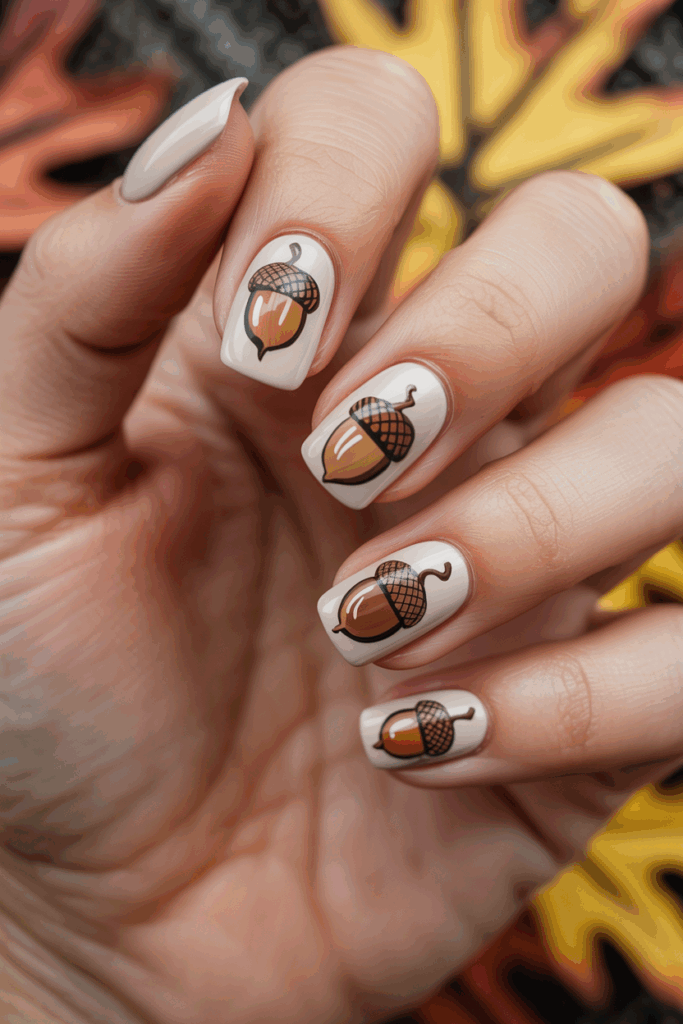 This design features short square nails painted with detailed acorn patterns. The acorns add a simple, seasonal touch that suits Thanksgiving well. It works best on natural nail shapes and offers a neat, festive look without being too bold.