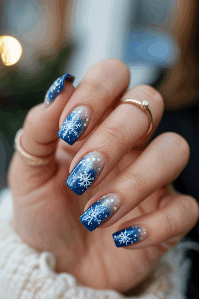 This design uses a soft icy blue base that feels calm and cool. White snowflakes are added for a seasonal touch. The look is simple but festive, fitting both casual and special holiday settings. It works well on short or medium-length nails.