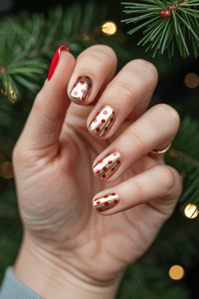 This design pairs shiny metallic gold nails with small red polka dots. The gold base adds a festive and elegant touch.