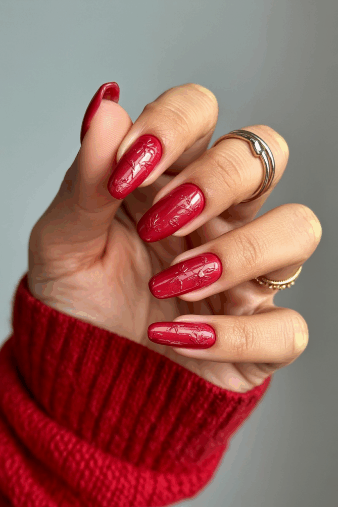 Cherry red nails with rhinestones add a touch of sparkle and elegance. This style works well on medium almond-shaped nails. The rhinestones enhance the festive feel without being too flashy. It is a simple but classy choice for Christmas.