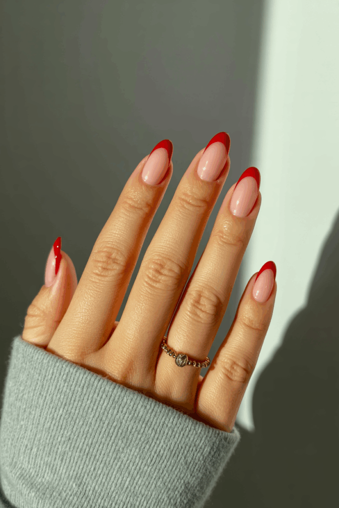 This design uses a soft nude base to keep the look simple and elegant. The red tips add a festive touch without being too bold. It works well for those who want a classic holiday style with a modern twist. The contrast highlights the nails while staying understated.