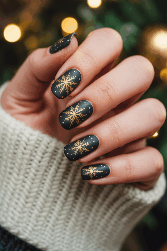 This design uses a deep black base to create a bold background. Gold snowflakes are added for a festive touch. The contrast makes the snowflakes stand out clearly.