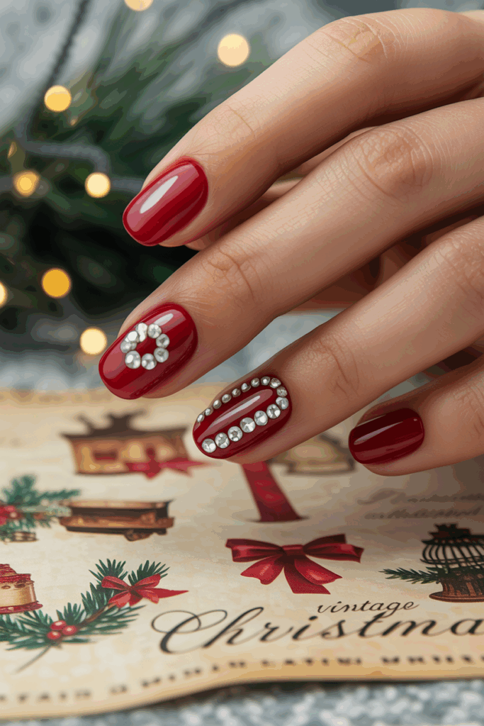 This design uses a bold red base to create a timeless holiday look. Small rhinestones add a subtle sparkle without being too flashy. They can be placed near the cuticle or at the tip for added detail. This style works well for many festive occasions.
