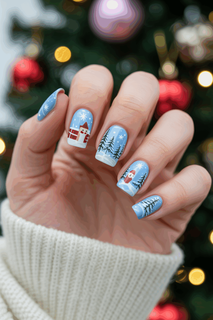 Winter wonderland nail designs often show snowflakes, pine trees, and small snowmen. These tiny details create a calm, festive look.