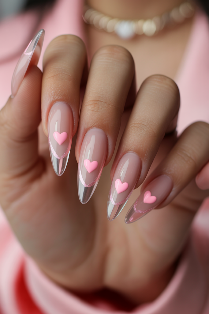 Metallic chrome nails offer a shiny, modern look for Valentine’s Day. They work well with heart-shaped decals for a simple yet stylish design.