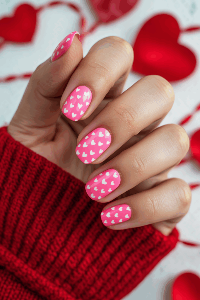 This nail design uses a bright pink base to create a bold and cheerful look. Tiny white hearts are scattered delicately across the nails, adding a simple but charming detail. It works well for those who want a classic Valentine’s style with a modern touch.