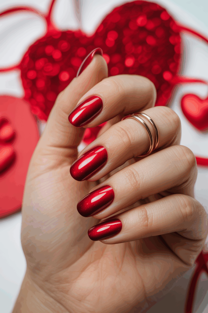 Chrome red nails offer a sleek and shiny look perfect for Valentine’s Day. The metallic finish catches light, adding a modern touch.