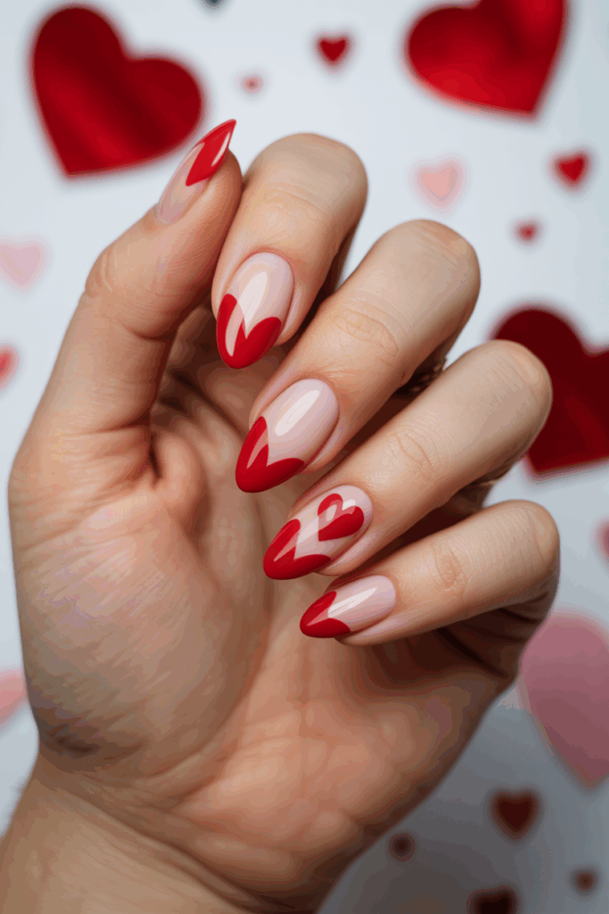 This style blends simplicity with a bold touch. The nude base keeps the nails looking natural and clean. Red tips add a clear pop of color, perfect for Valentine’s Day.