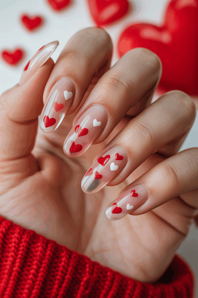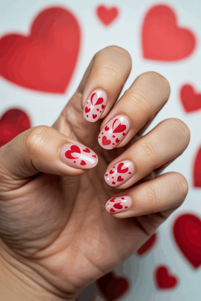 The floating hearts add a subtle Valentine’s touch without being too bold. It works well for anyone who prefers minimal nail art.