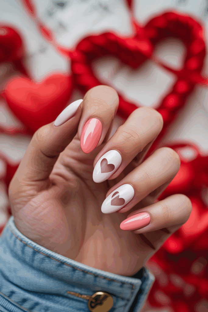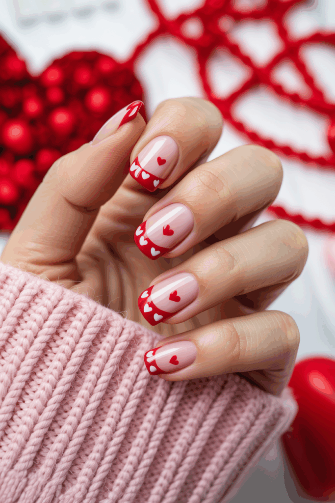 This style adds small heart shapes to classic French tips. It creates a delicate, romantic look perfect for Valentine’s Day.
