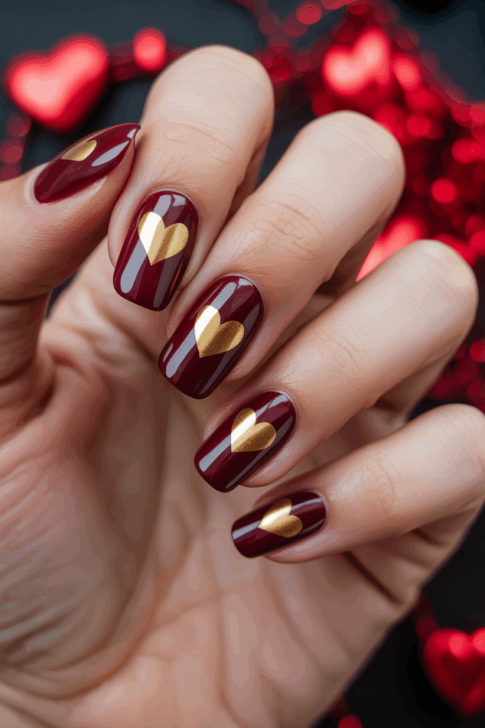 They feature a simple red base with small heart shapes on the tips. This look blends the classic charm of red nails with a subtle Valentine’s touch. It is easy to do at home or request at a salon.