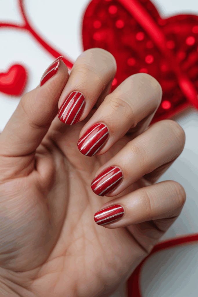 This nail design pairs a shiny red base with thin silver stripes. It creates a clean and modern look suitable for Valentine’s Day.