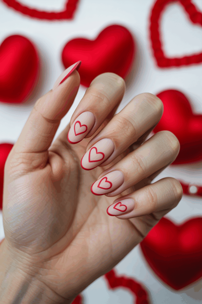 Each nail has a simple red heart outline, adding a subtle Valentine’s touch.