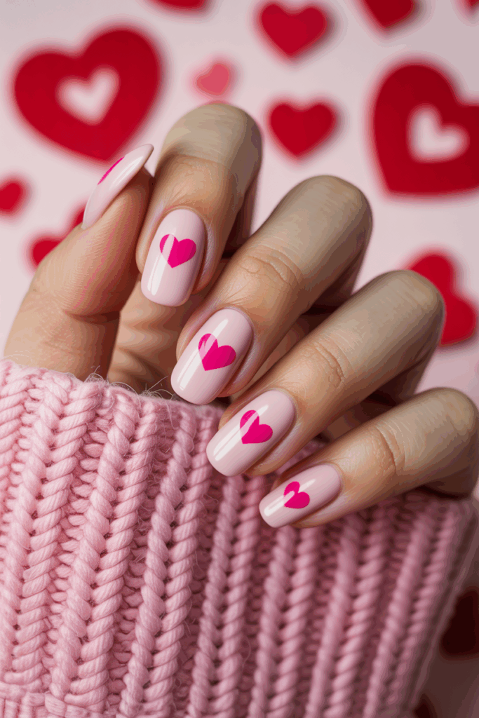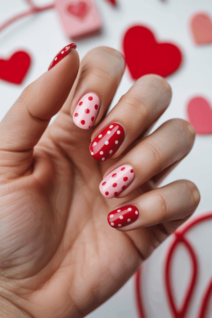 This design pairs pink and red polka dots for a playful yet classic look. It works well with both matte and shiny finishes. The dots add a simple pattern that feels fresh and festive for Valentine’s Day.