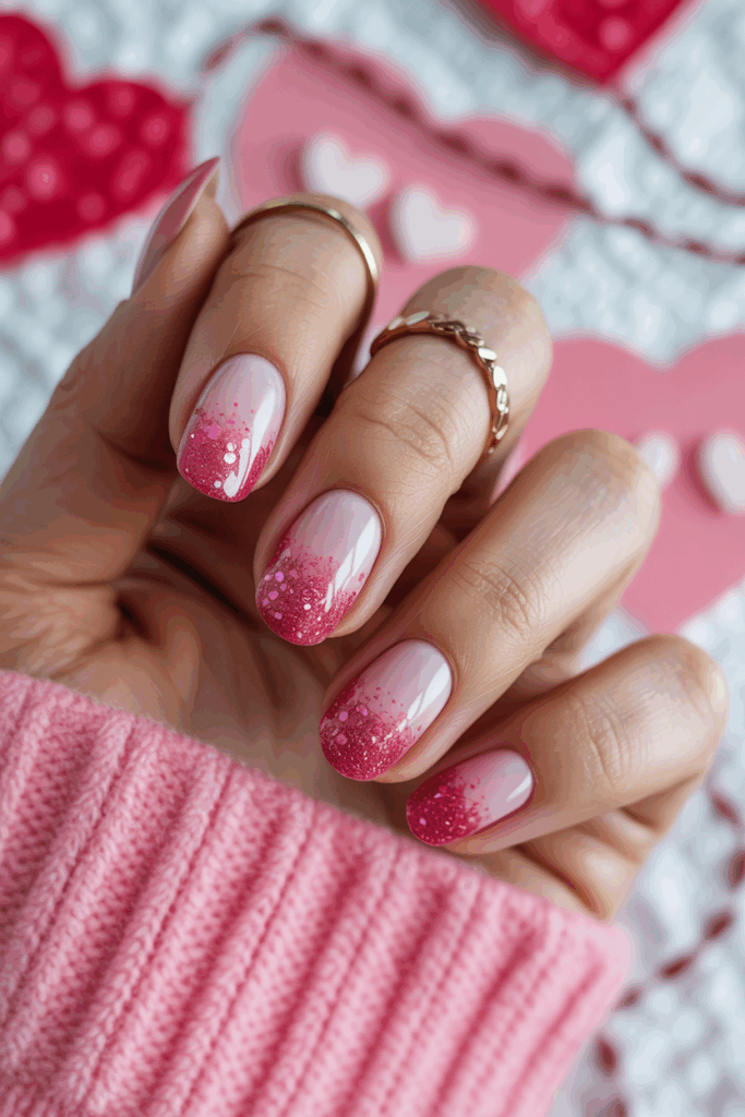 The glitter highlights the ombre effect, making nails look elegant and festive. It works well for Valentine’s Day or any special event.