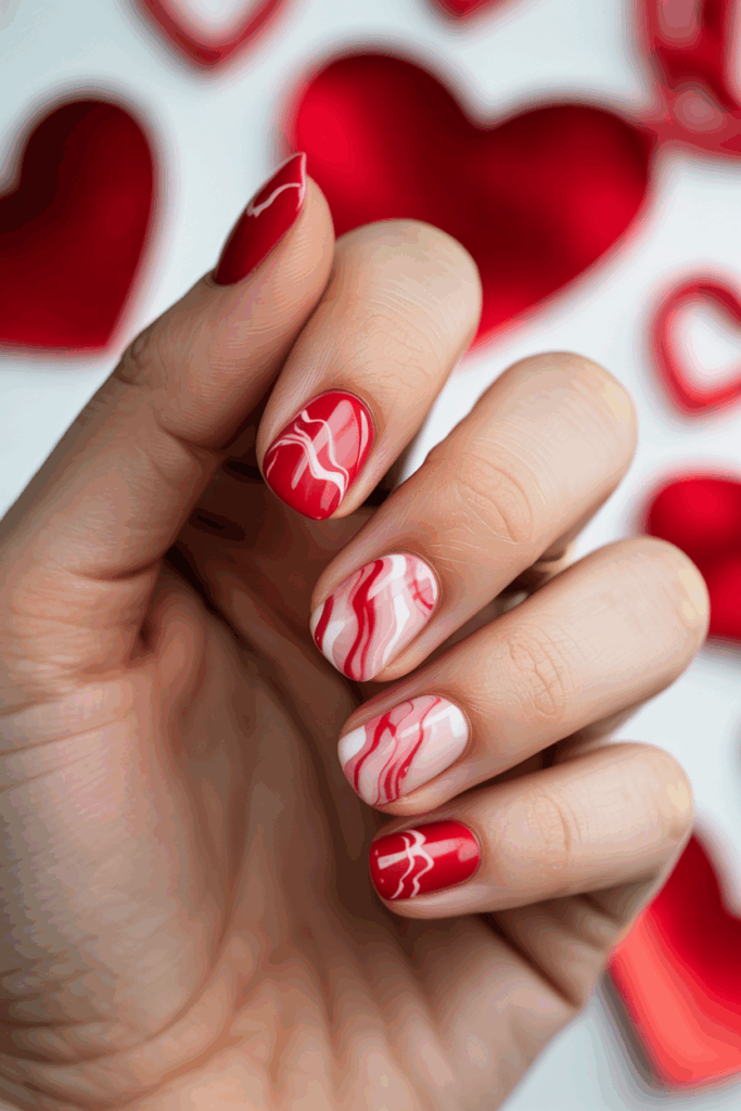 Red and white marble nails mix bold and soft colors. They create a smooth, swirled look that stands out. This style suits those who want something creative but not too flashy. It works well for Valentine’s Day and shows a subtle love theme.