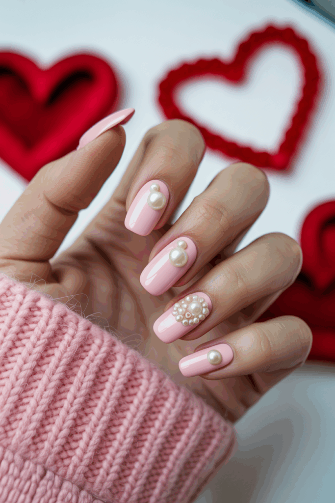 This design uses a soft, baby pink base to create a gentle, romantic look. Small pearl accents are placed near the cuticles or in delicate patterns. The pearls add a touch of elegance without being too flashy. It is a simple yet classy choice for Valentine’s Day.