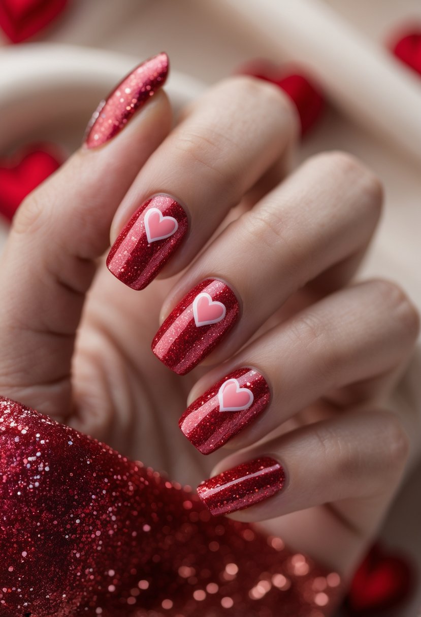 This design combines a sparkling red glitter base with small heart decals. It adds a subtle yet festive touch perfect for Valentine’s Day. The hearts stand out against the glitter, creating a balanced look that is both simple and elegant.