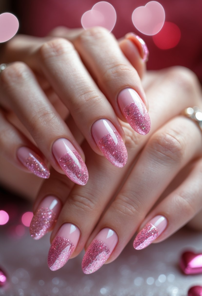 Glittery pink French tips add a subtle sparkle to a classic look. They work well for Valentine’s Day because they bring a festive yet polished feel.