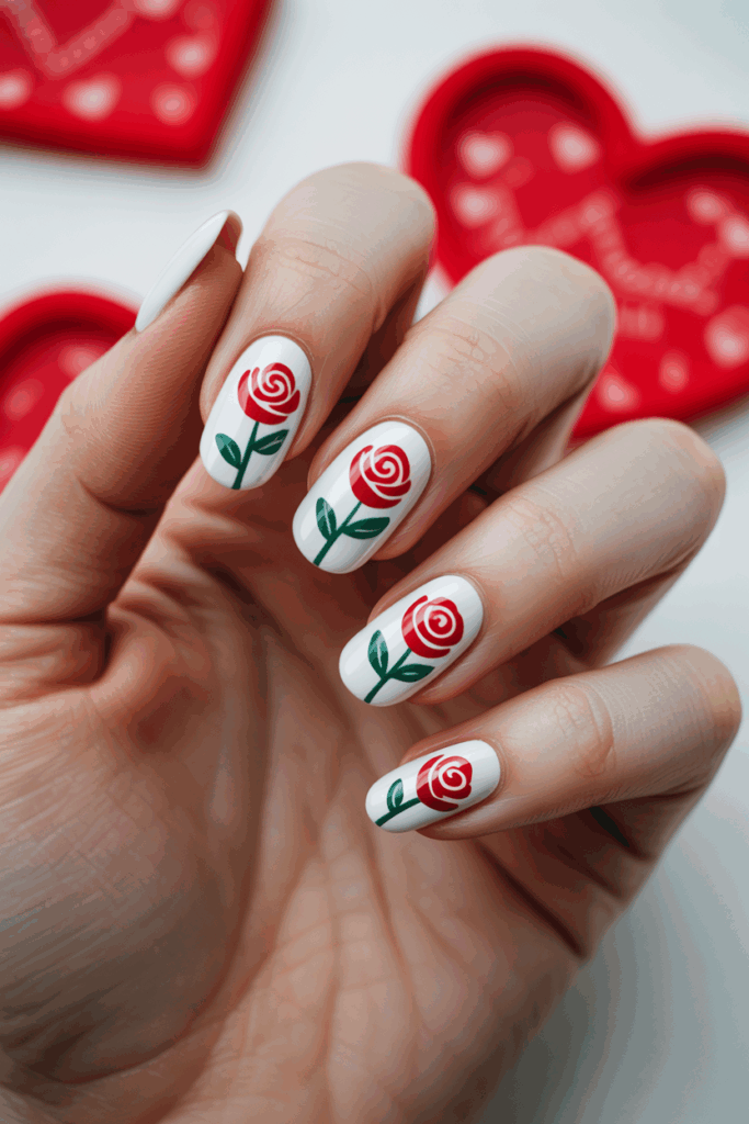 The contrast between the white and red makes the roses stand out. This style works for both simple and more intricate nail shapes.