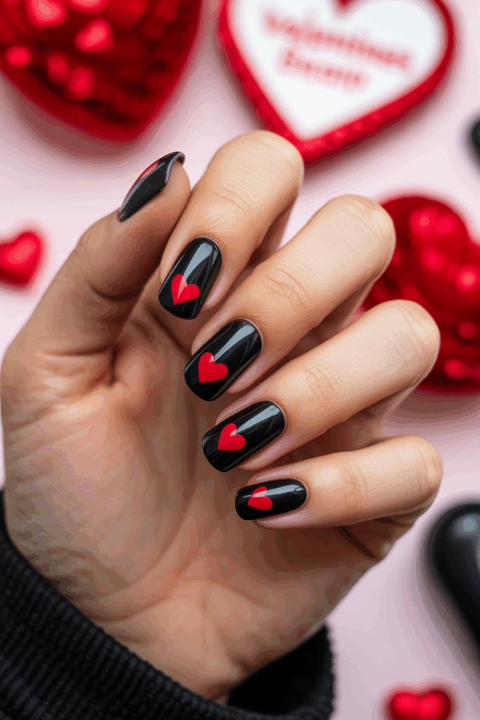 Black and red create a strong contrast that works well for Valentine’s nails. Small red hearts on a black base add a classic and elegant touch.