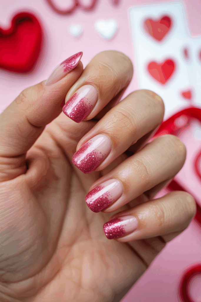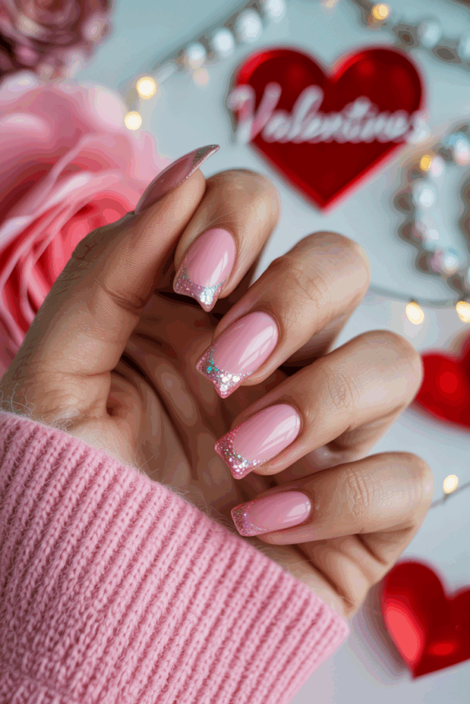 This design uses a bright pink base that stands out clearly. The tips are decorated with sparkles for a simple yet eye-catching effect. It adds just enough shine without being too overwhelming. This look works well for both everyday wear and special Valentine’s Day occasions.