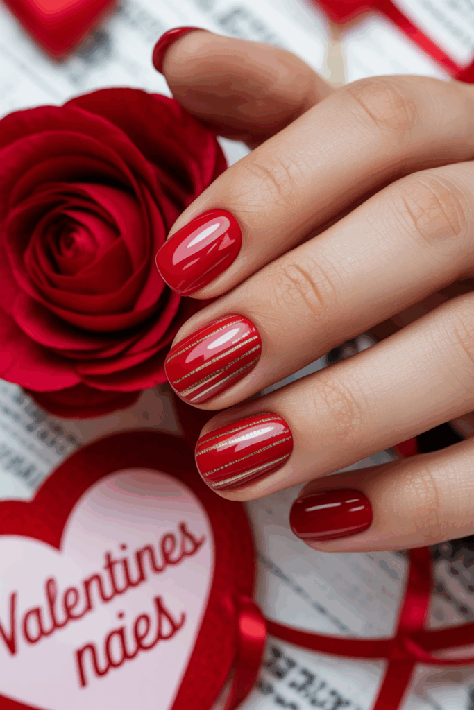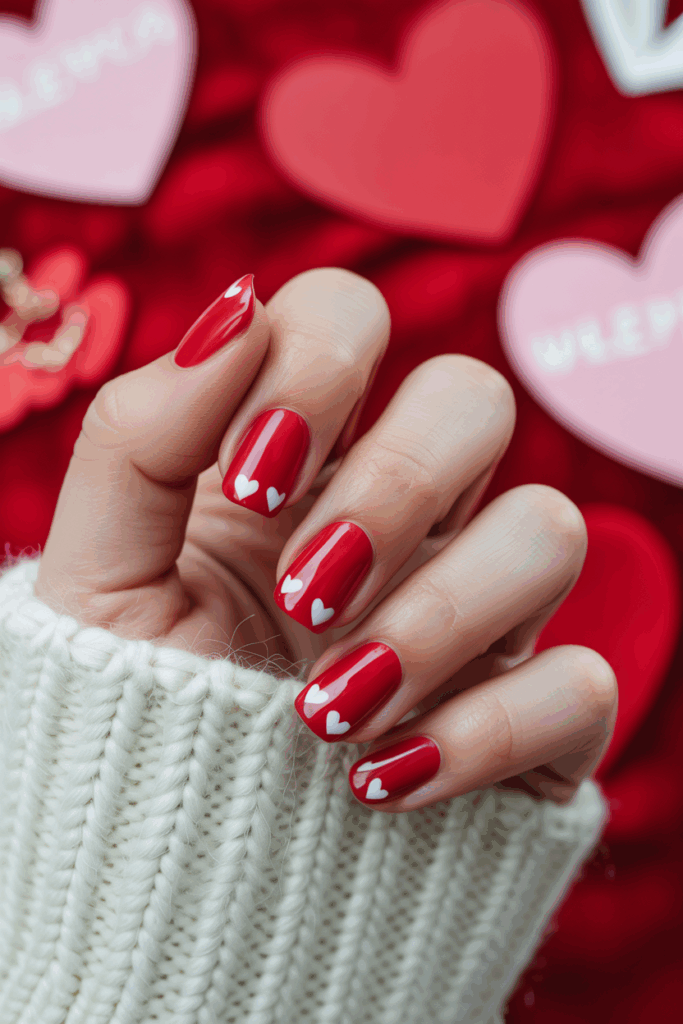 The style is simple but festive, perfect for those who want a traditional Valentine’s Day manicure.