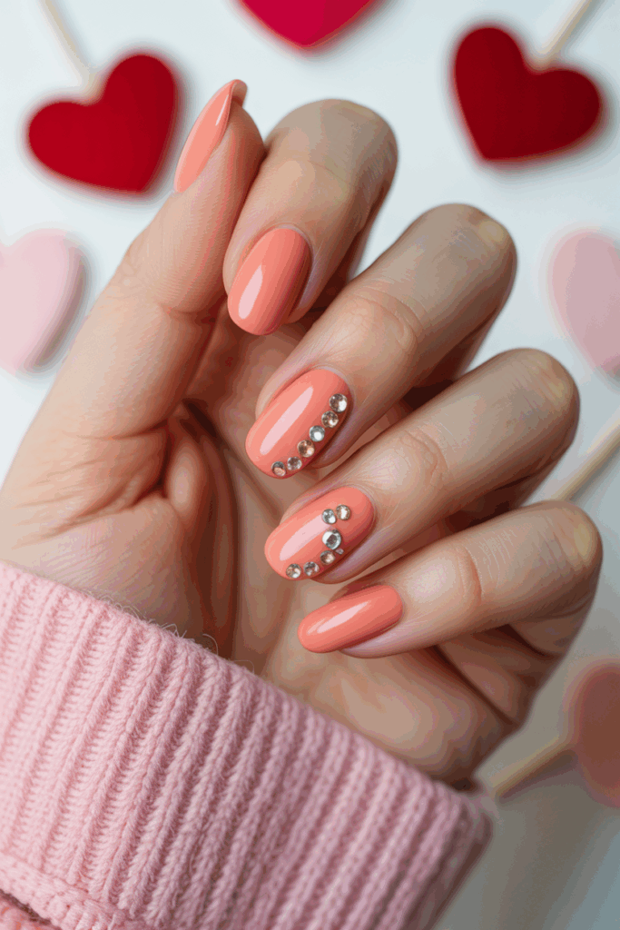 This nail design pairs coral pink polish with small rhinestones for a delicate touch. The rhinestones add subtle sparkle without overpowering the color. It works well for both casual and special occasions.