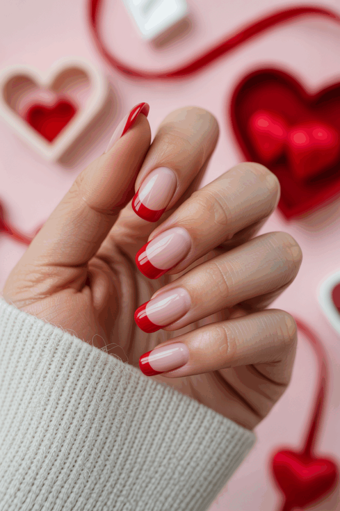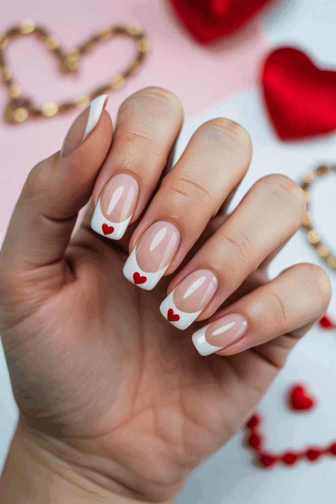 This style adds small heart shapes to the classic French manicure. The hearts are usually placed near the tips or base of the nails. It offers a simple but romantic twist suitable for Valentine’s Day or any time.