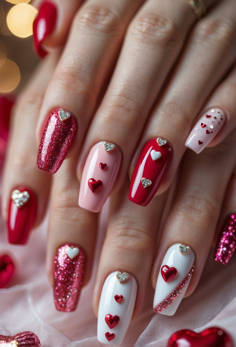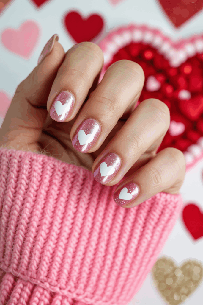 This design uses a soft pink base with a fine layer of glitter for subtle shine. Heart-shaped decals add a clear, romantic touch without being overwhelming. It works well for anyone wanting a simple but festive Valentine’s look. The mix of glitter and hearts creates a balanced, elegant style.