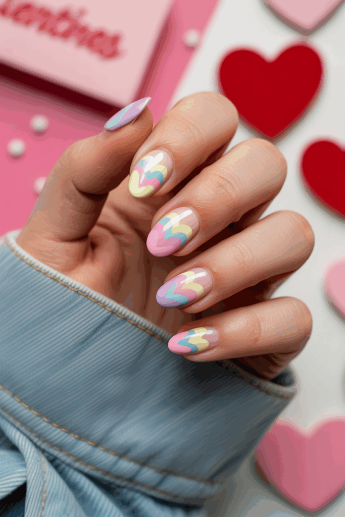 Layered hearts in pastel colors create a soft and elegant look. This design uses light shades like pink, lavender, and mint to add depth. It works well for those who want a subtle yet stylish Valentine’s Day nail art.