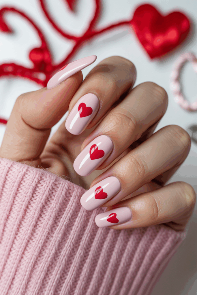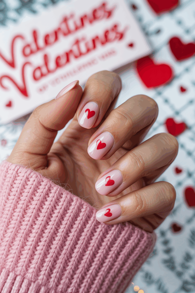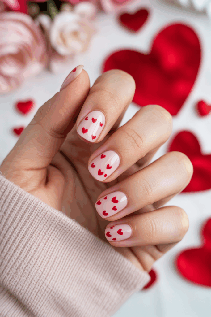 This design uses a soft nude base that looks clean and simple. Small hearts are painted delicately on the nails, adding a touch of charm without being too bold. It works well for those who want a quiet, elegant look for Valentine’s Day.