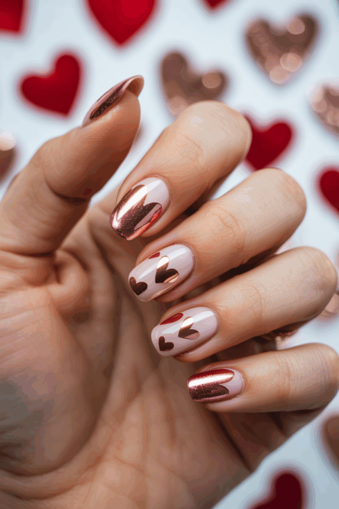 Rose gold foil hearts add a modern and romantic touch to nails. The metallic shine contrasts well with matte or soft pastel bases. This look is simple yet elegant for Valentine’s Day or any special occasion.