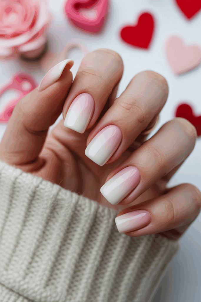This nail design blends soft pink into white for a gentle gradient. It creates a smooth and elegant look that suits many occasions. The subtle colors bring a calm and romantic feel without being bold. This style works well with both glossy and matte finishes.