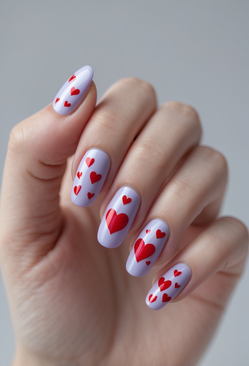 This design uses a soft lilac pink base for a gentle look. Small red hearts add a clear Valentine’s theme without being too bold.