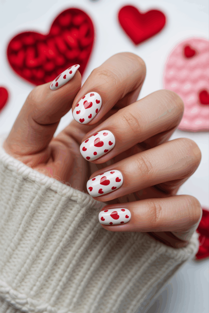 This design uses a clean white base to highlight red polka dot hearts. The small hearts are evenly placed, creating a balanced and simple look. It combines classic Valentine’s colors in a neat and stylish way. This style works well for any nail length or shape.