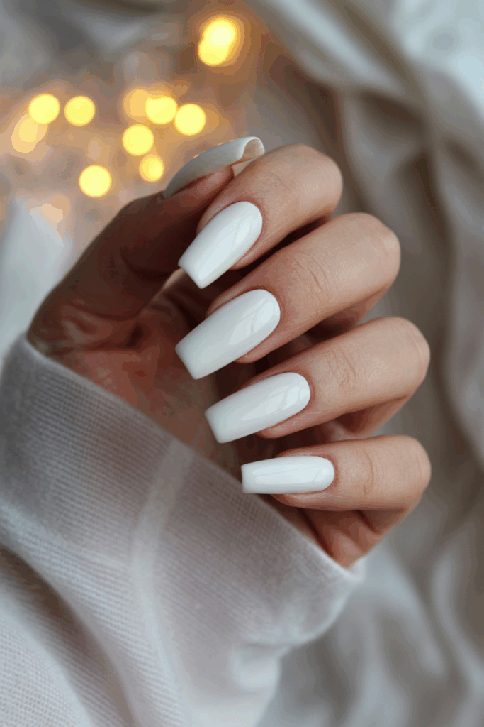 Classic white acrylic nails offer a clean and timeless look. They provide a smooth canvas that suits any holiday outfit.