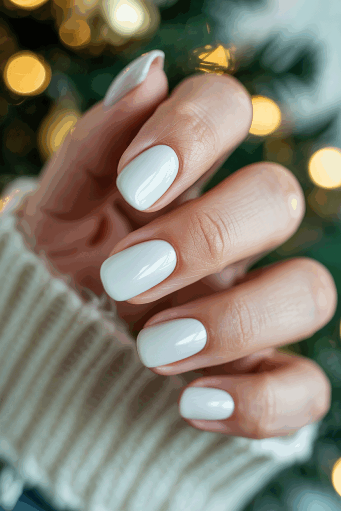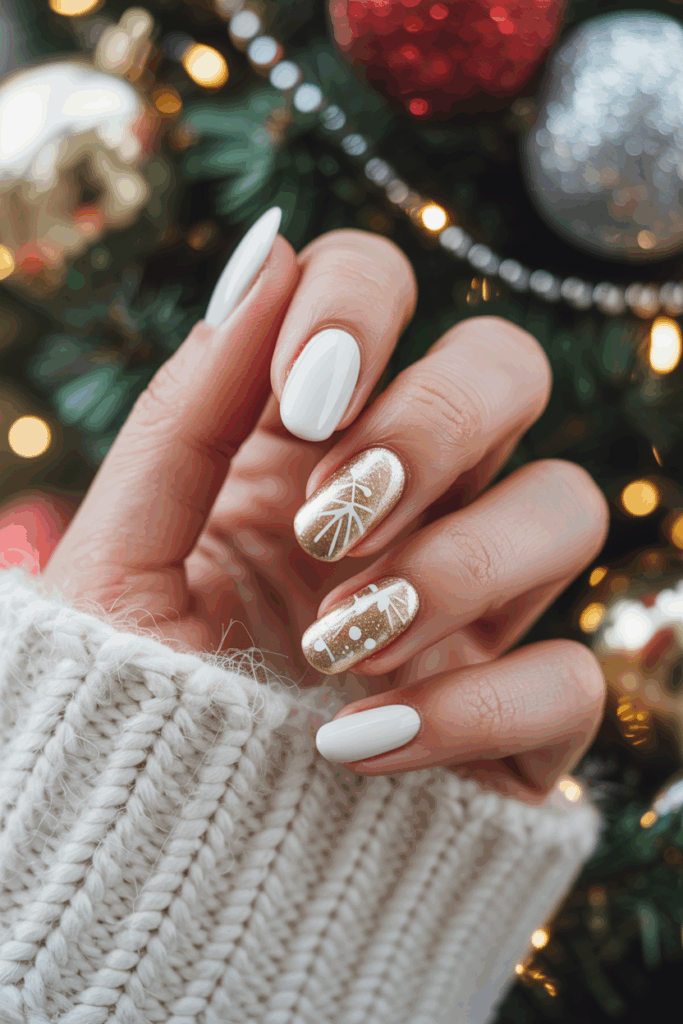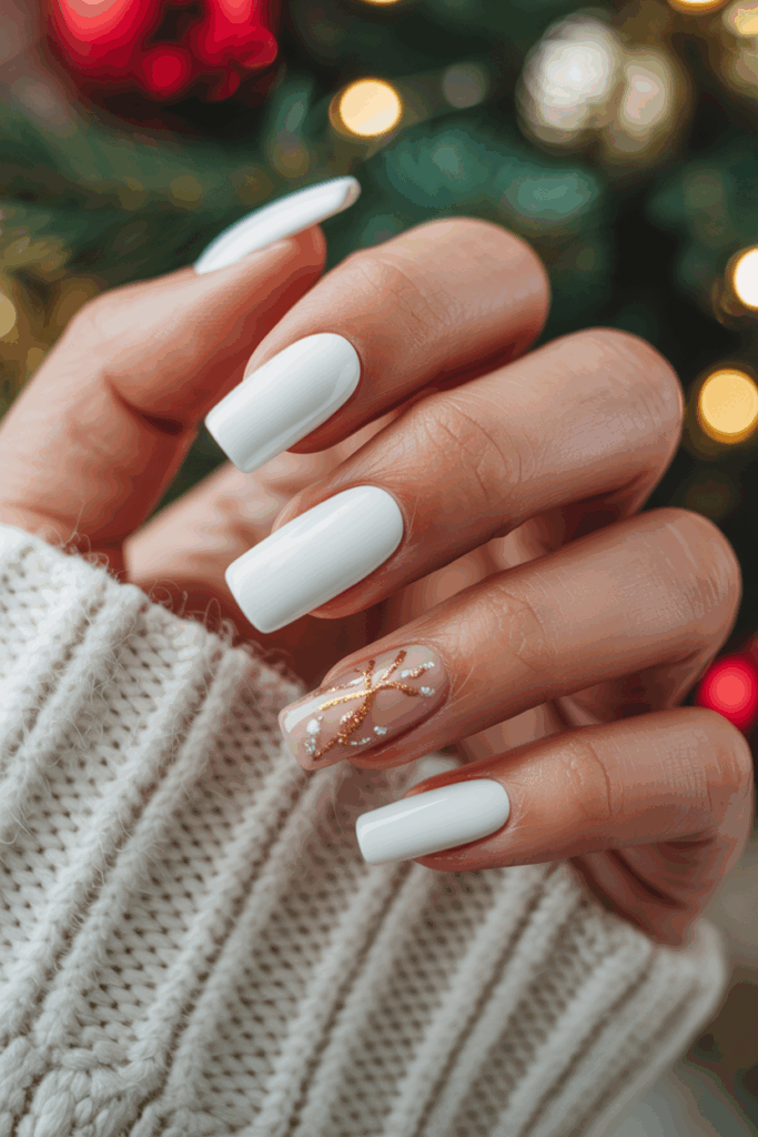 These nails feature a soft, creamy white base that looks clean and simple. They often include subtle details like thin gold tips or small accents. This style suits anyone wanting a refined and classic holiday look.
