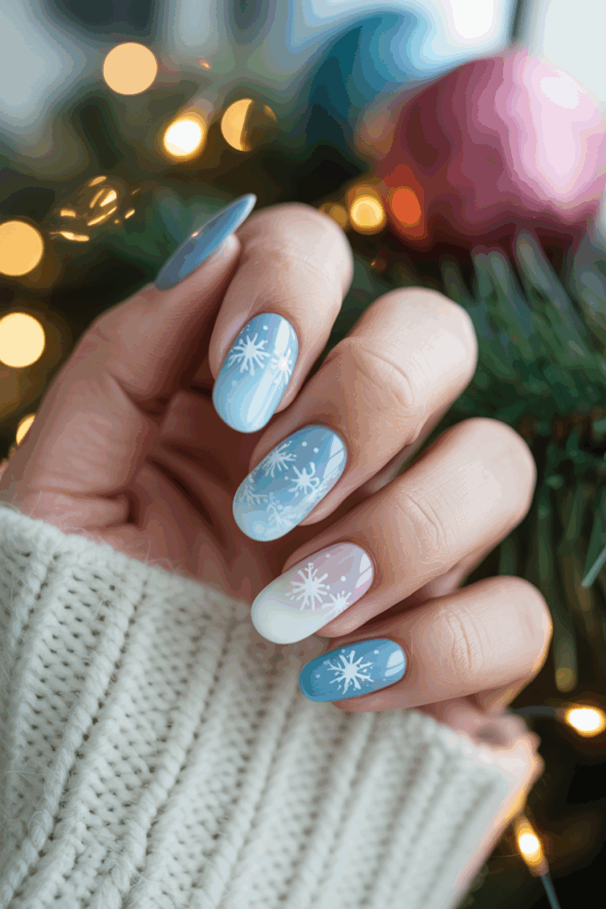 This style balances festive charm with elegance. Fine-tip brushes or nail stickers can help create crisp snowflake shapes for a clean, polished look.