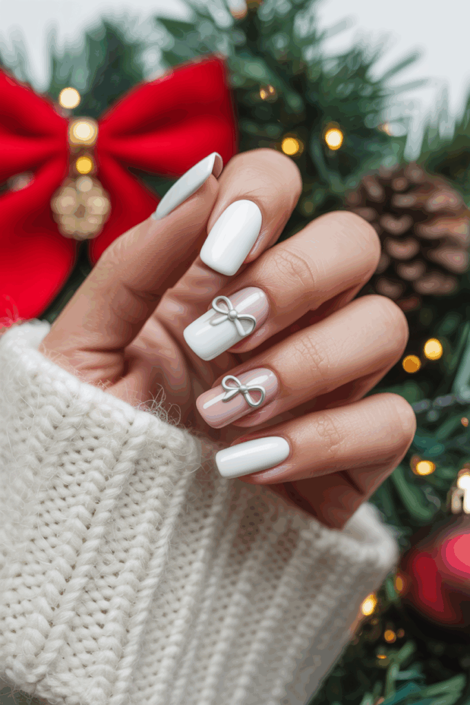 White nails with bow accents add a simple but stylish touch to holiday looks. The bows can be small and delicate or bold and shiny.