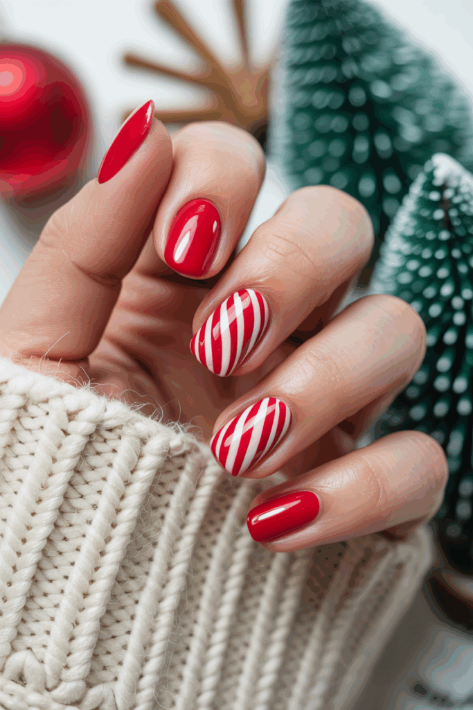 This design features bright red nails with classic candy cane stripes on a few accent nails. The red base adds a bold, festive touch.
