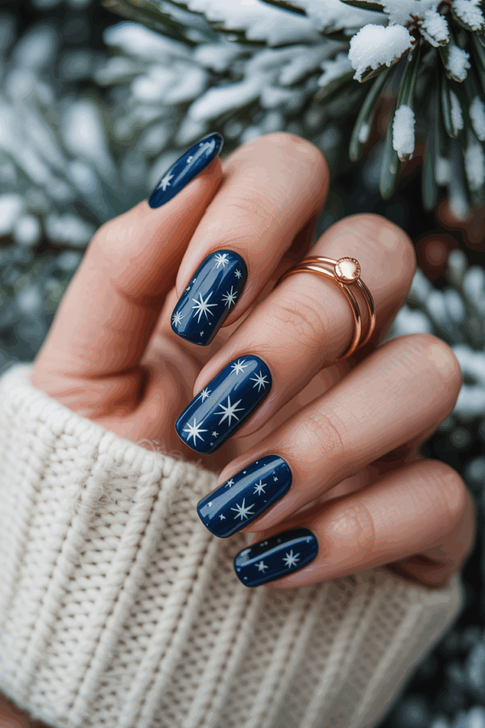 This design uses deep navy blue as the main color. Small star shapes add a subtle, elegant detail. The look feels both modern and timeless, fitting well for winter events or everyday wear. It pairs easily with other winter styles.